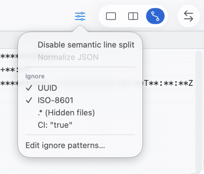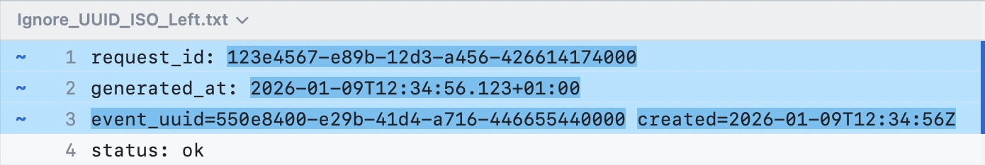 UUID と 8601 パターンを有効にすると、差分目的で一致する値は無視されます。